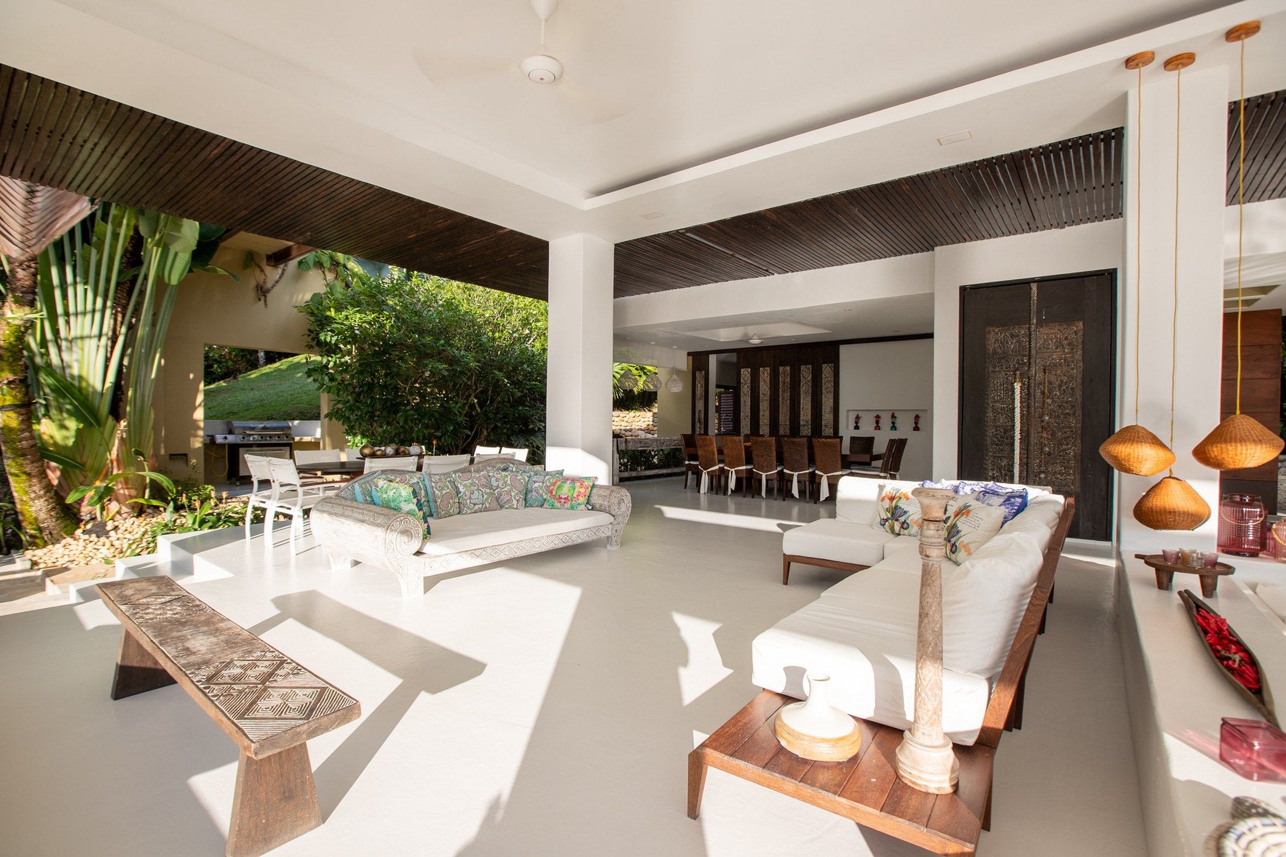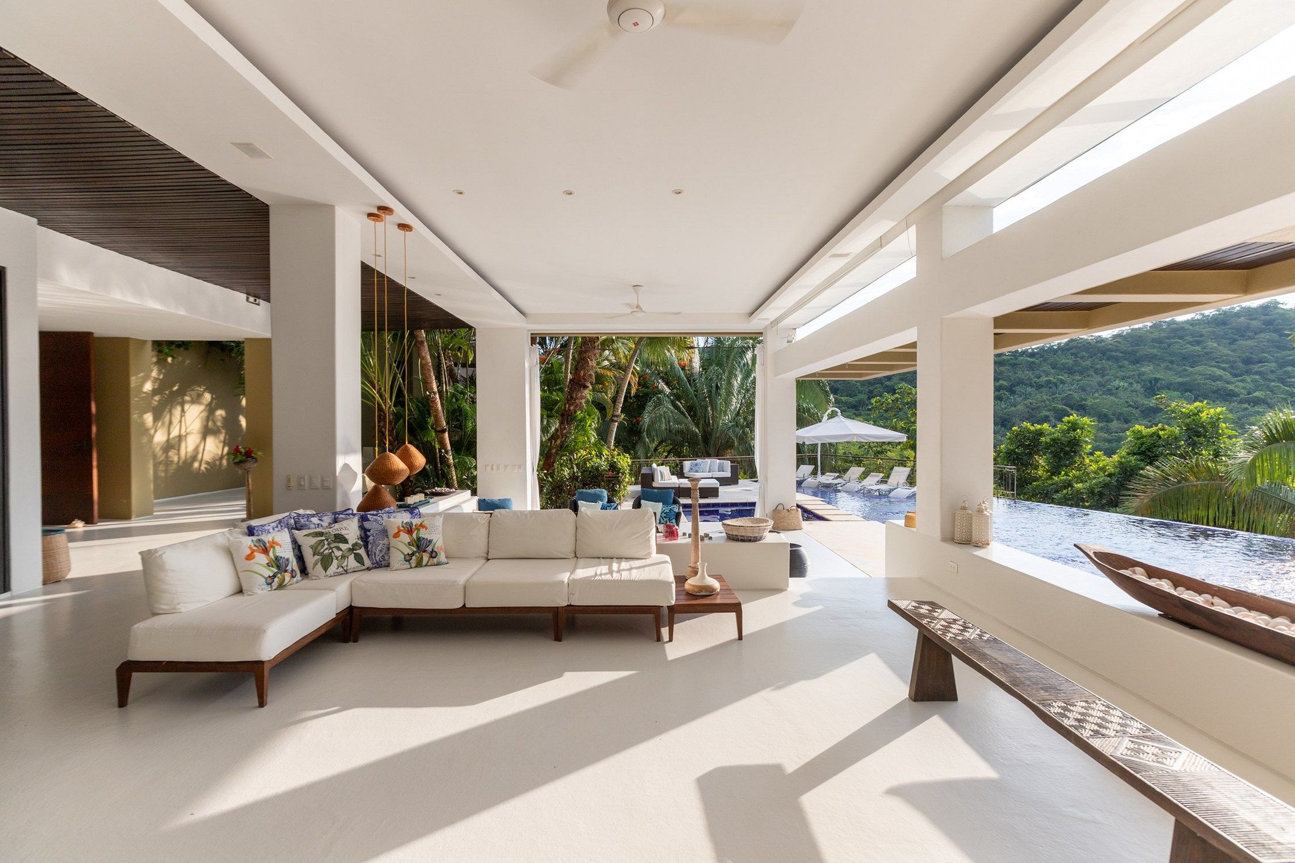The house is spacious in all rooms, starting with the living and dining room which are open with an incredible view of the mountains and the lake. The villa has sofas and dining tables both indoors and outdoors, and the living room has direct access to the large private pool.