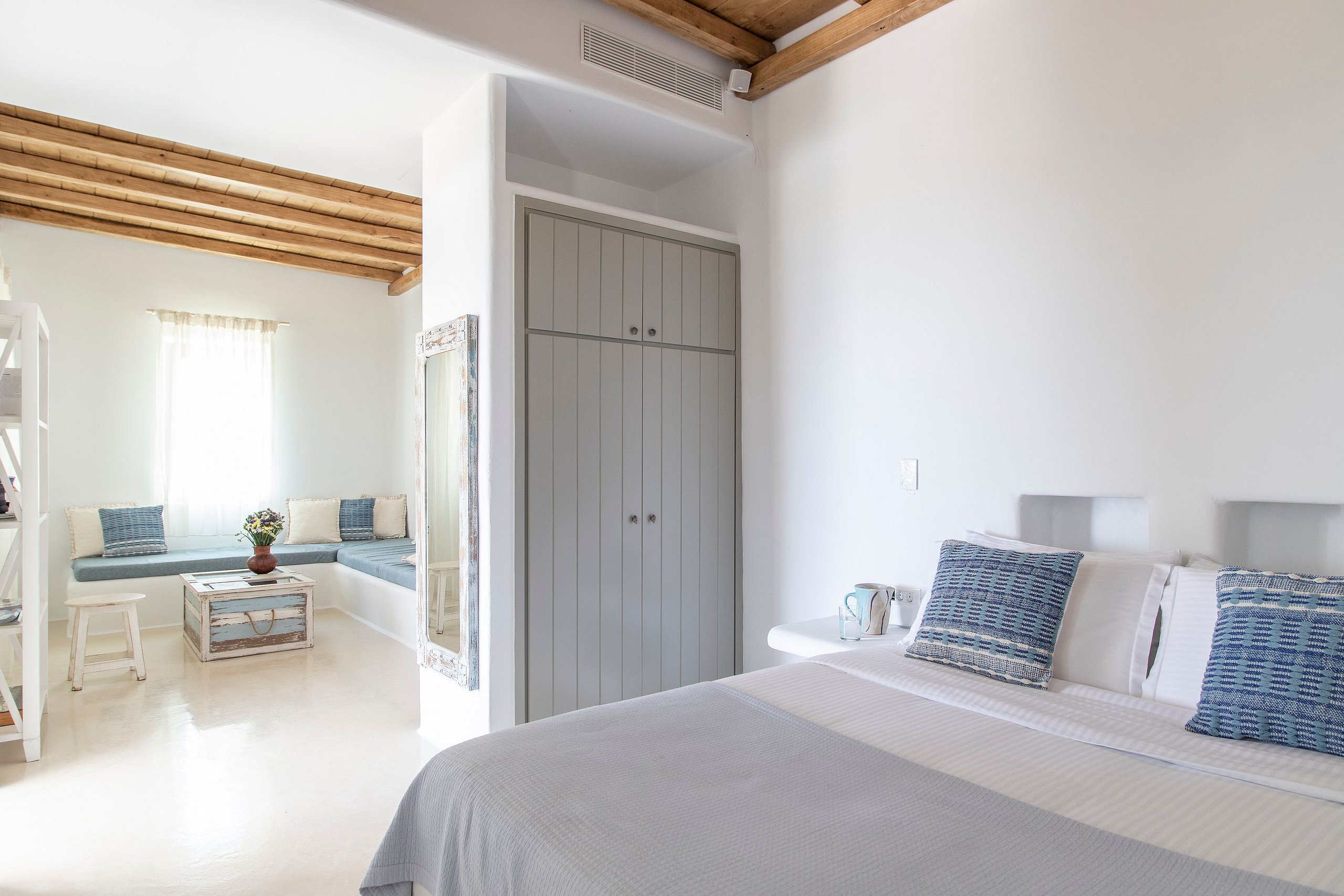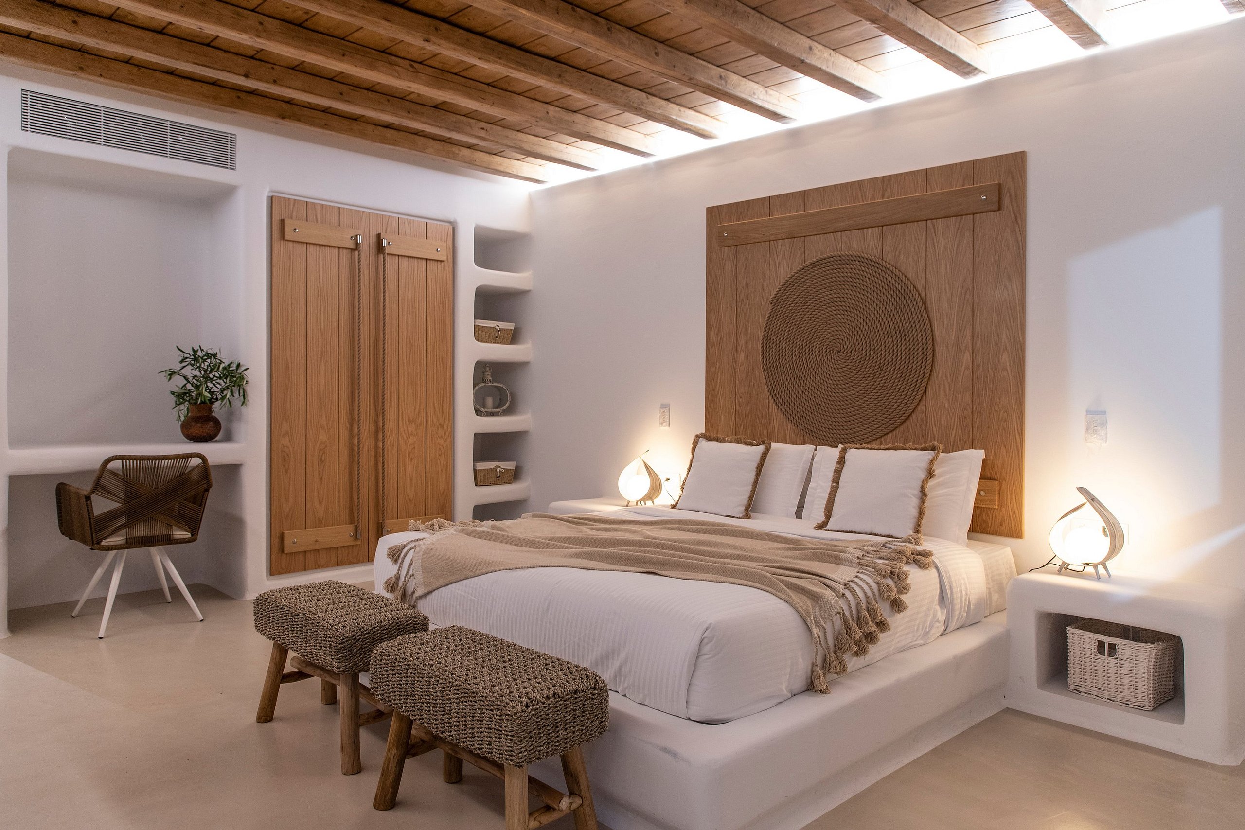 Its interior design, which boasts a chic island-modern style, is a harmonious blend of traditional Cycladic architecture and contemporary luxury.