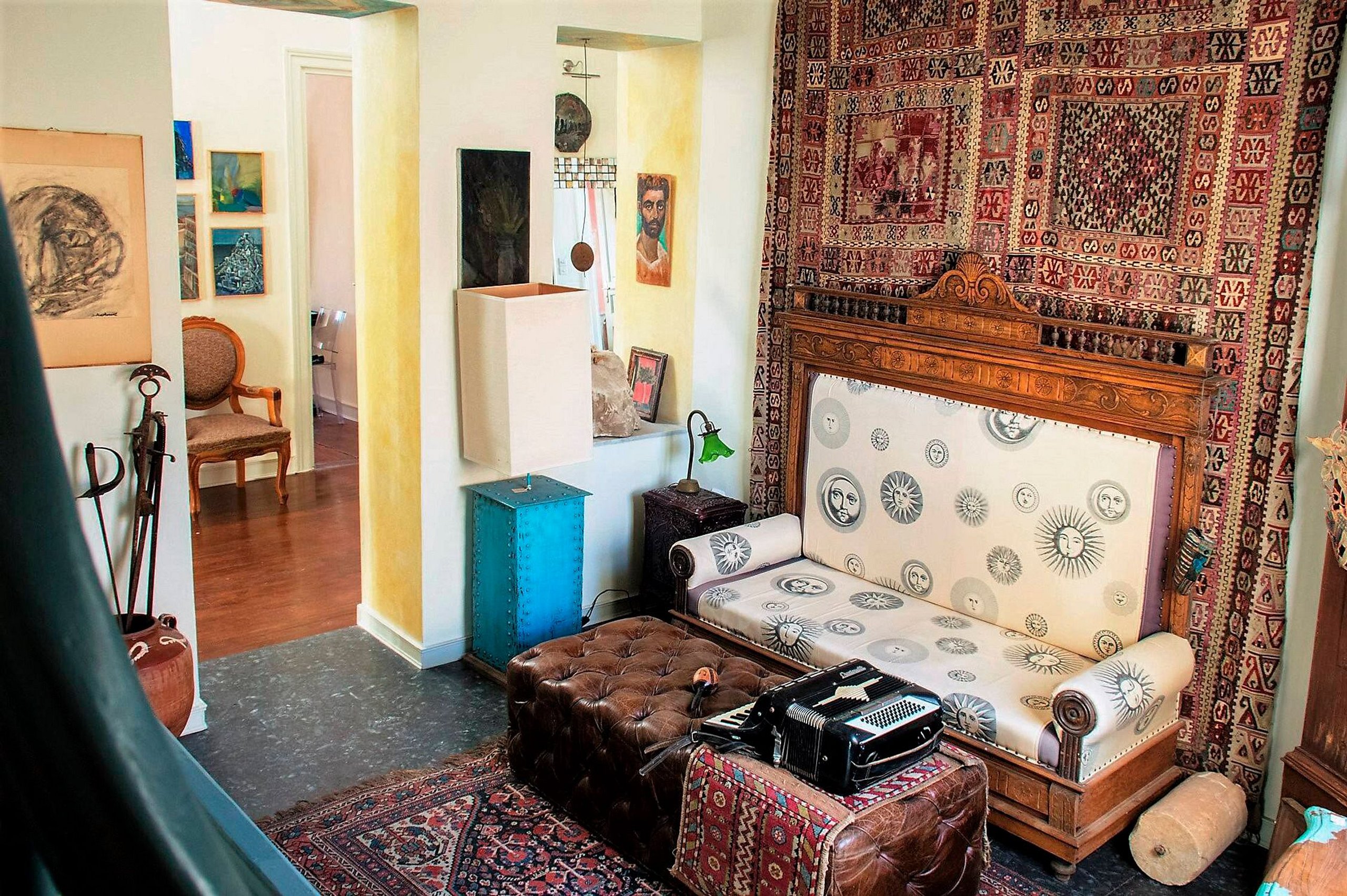 For the first Floor leading the wooden stairs where located is a living room (120m2) decorated with unique pieces of art, two bedrooms, the kitchen (15m2) fully equipped with every modern amenity, including a dishwasher, fridge, cutlery, microwave oven, filter coffee, and espresso makers, oven and a table, the dining room which can seat up to 8 people, the study and the balconies with the stunning view.