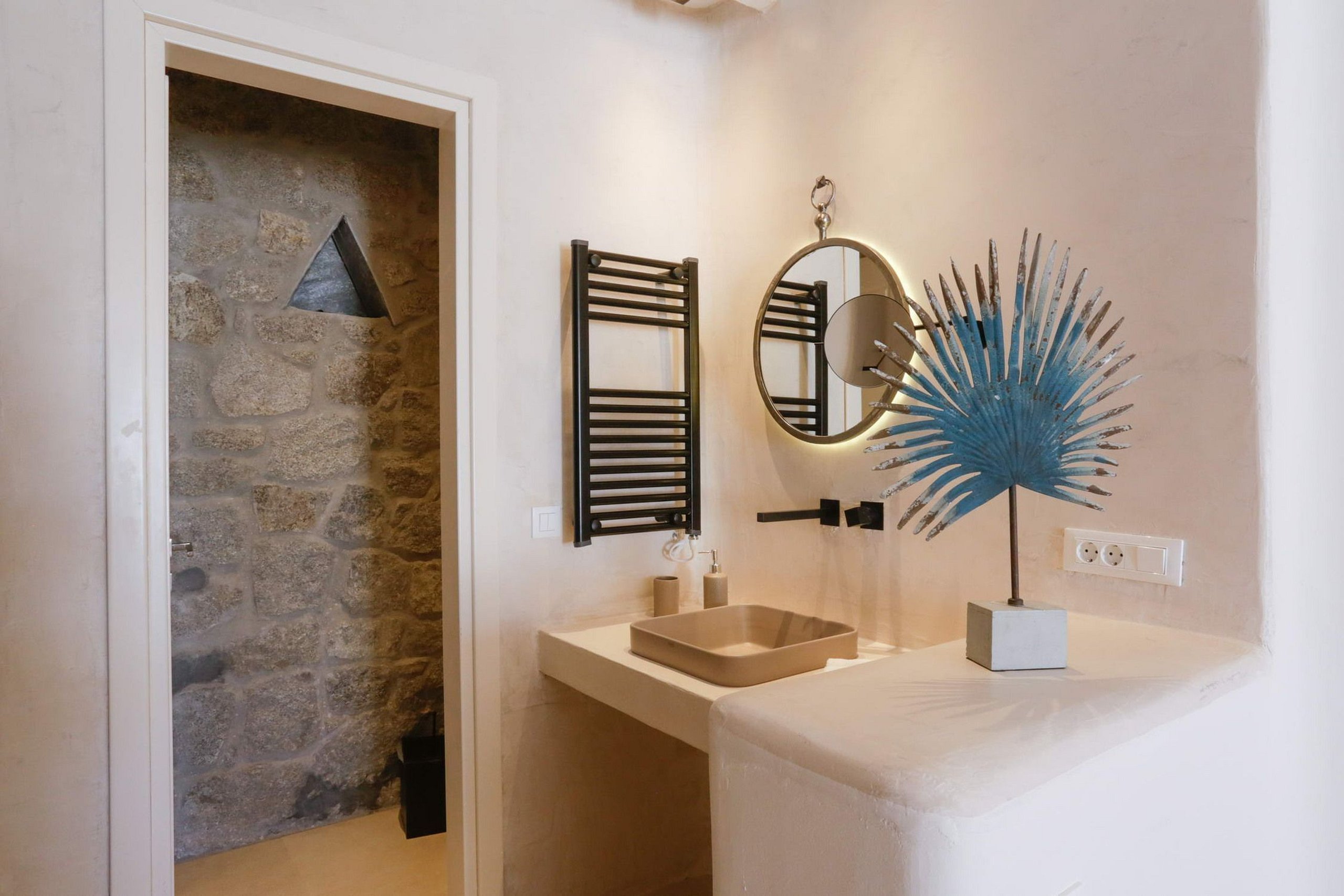 This villa in the heart of Kanalia is located facing the sea and the iconic windmills, two minutes from Ornos and a few kilometers from the city center.