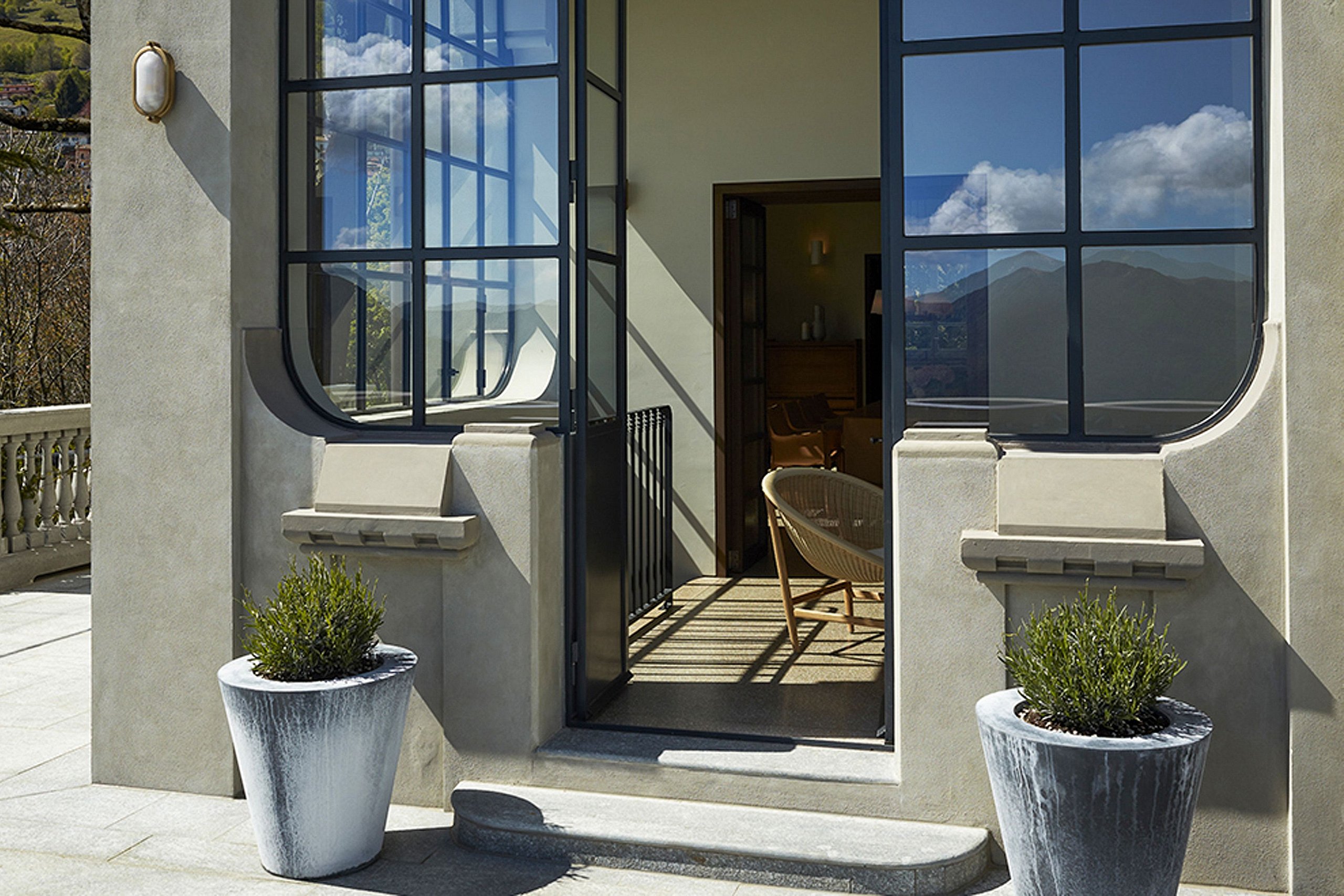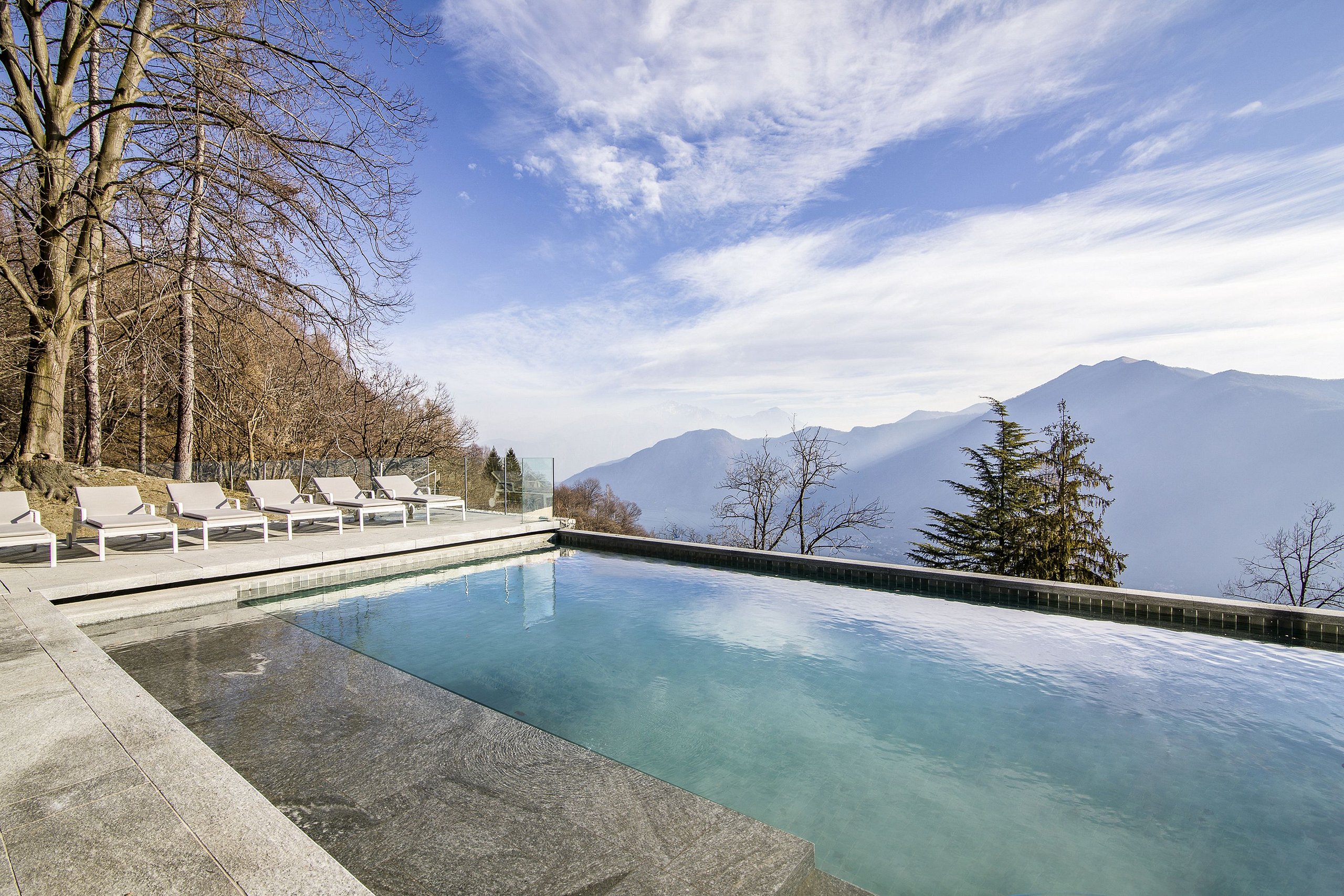 The views from south-facing Villa are truly stunning – a combination of the wide blue lake and green mountain vistas rounded off with glorious golden sunsets. These can be enjoyed from the balconies off every bedroom, the villa’s main surrounding terrace, and the extraordinary pool house with its green roof and infinity pool. Also making the most of this aspect are an exceptional yoga/wellness room that has been carved out of the cliff face and the rooftop terraces, bar, and entertainment area.