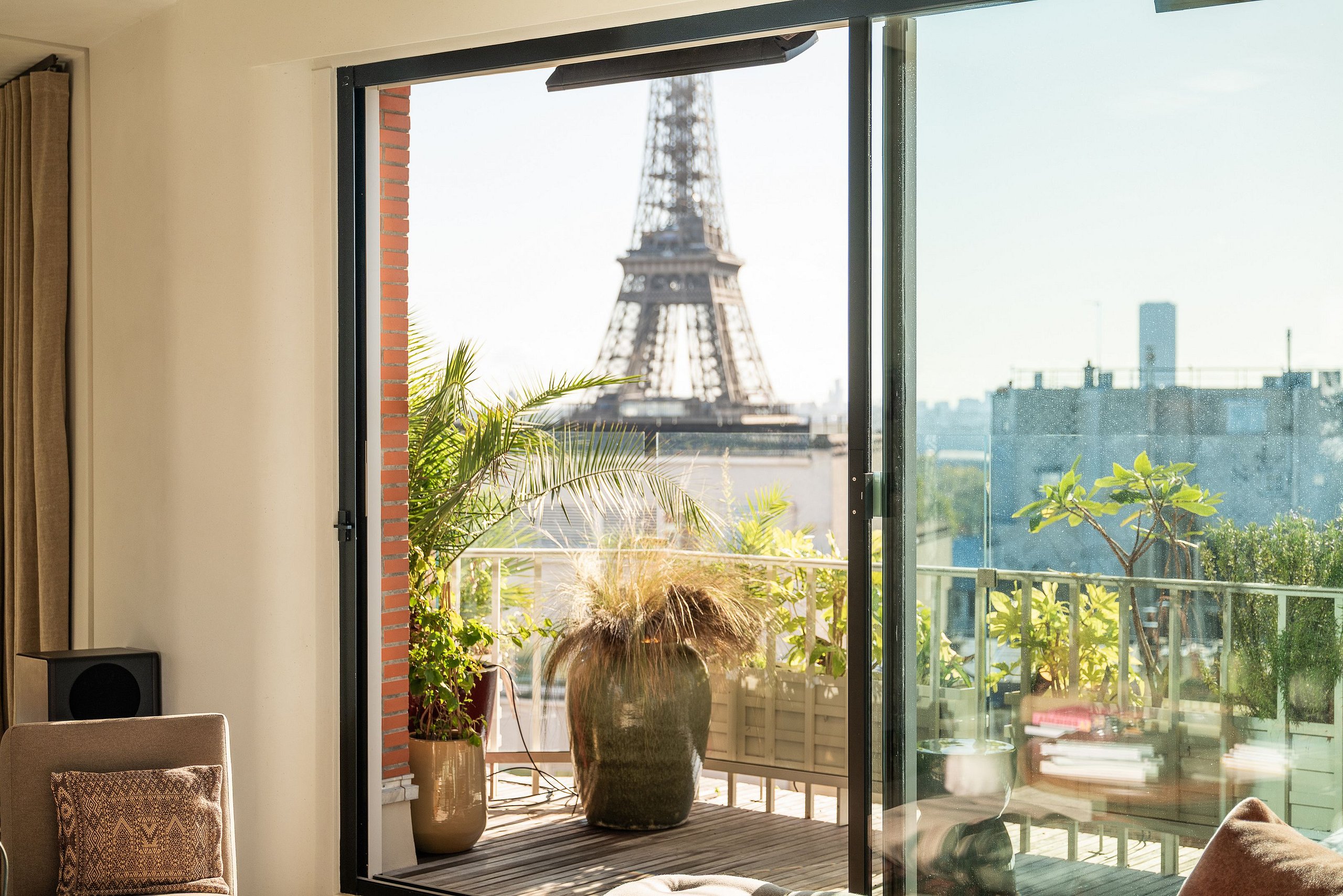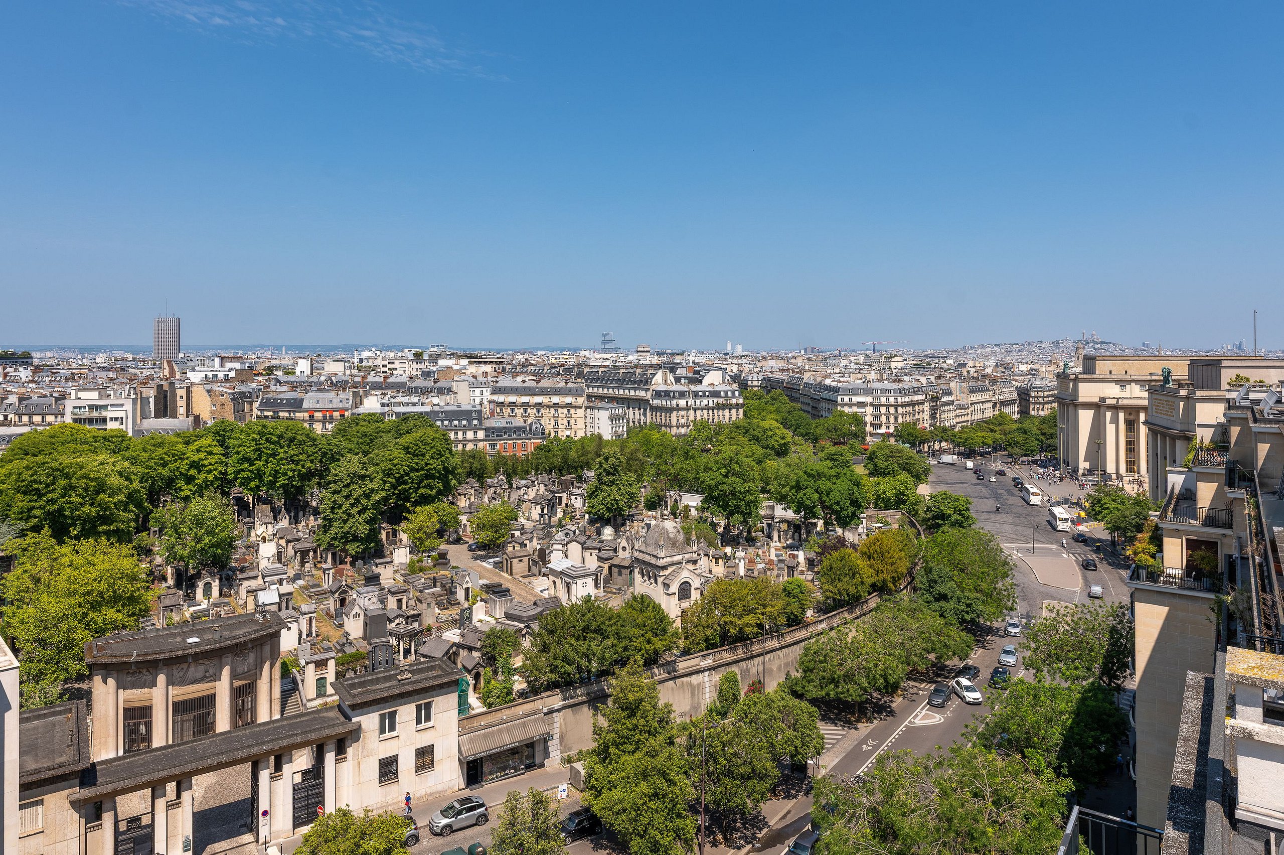 The unique layout includes expansive balconies on either side, offering breathtaking panoramic views of the capital's icons: the majestic Eiffel Tower, the Seine, Trocadéro, the picturesque Butte Montmartre, and the vibrant La Défense district.