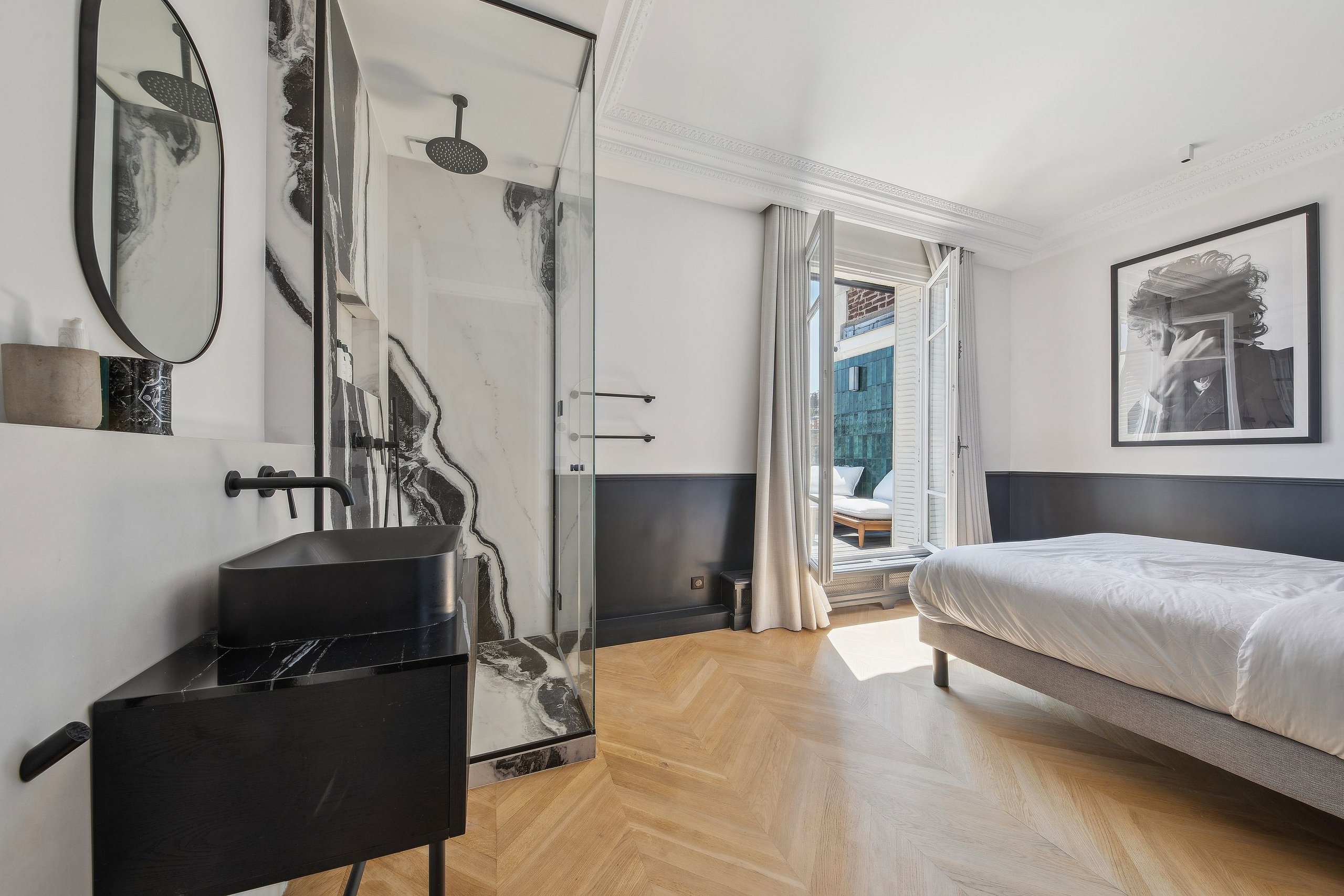 This sumptuous duplex spans an impressive surface area and features four beautifully appointed ensuite bedrooms. Each bedroom is a private sanctuary of comfort and refinement, complete with premium bedding, elegant furnishings, and a serene atmosphere—perfect for unwinding after a day exploring the city.