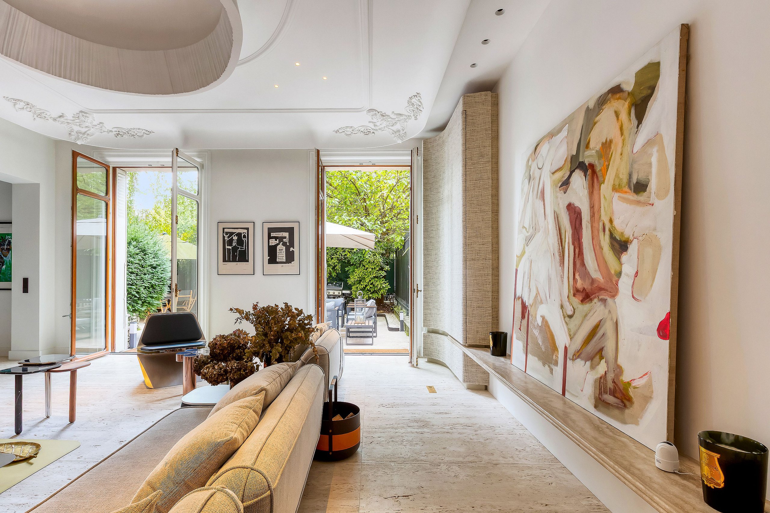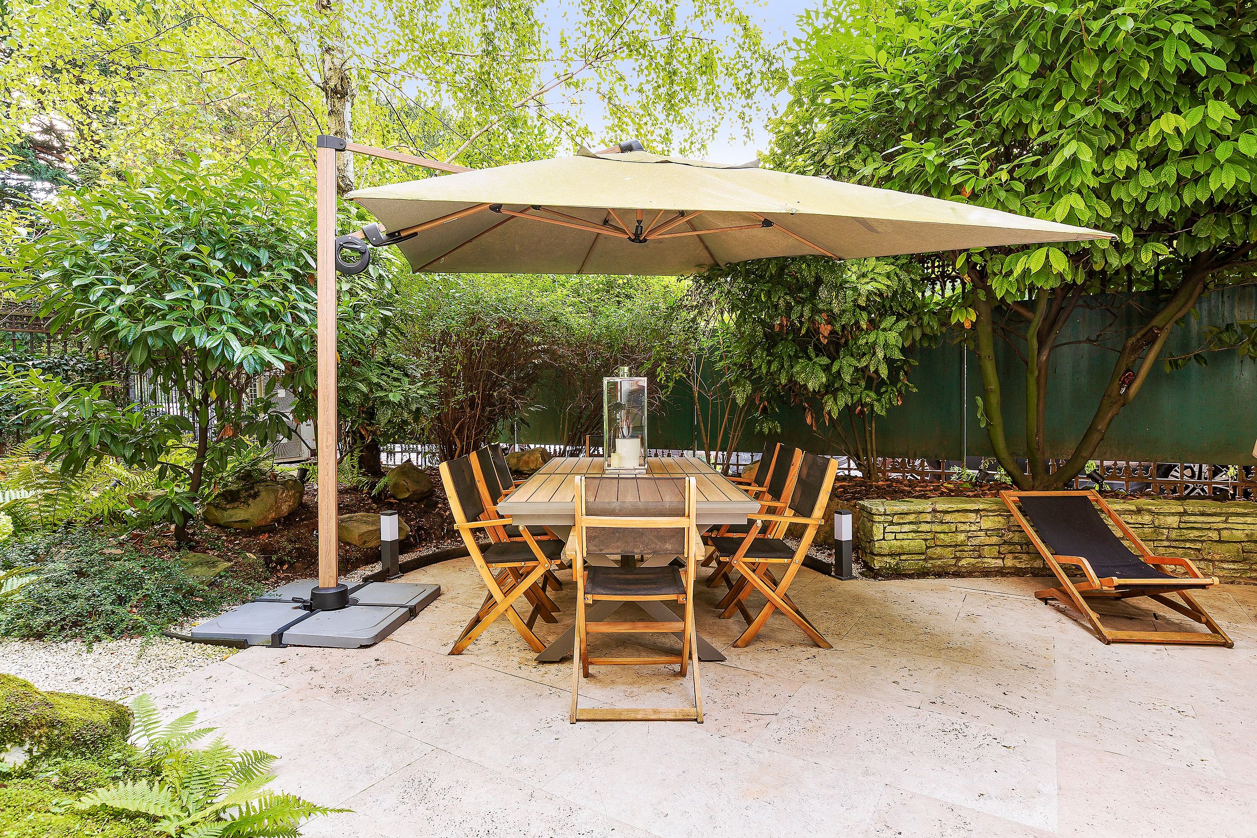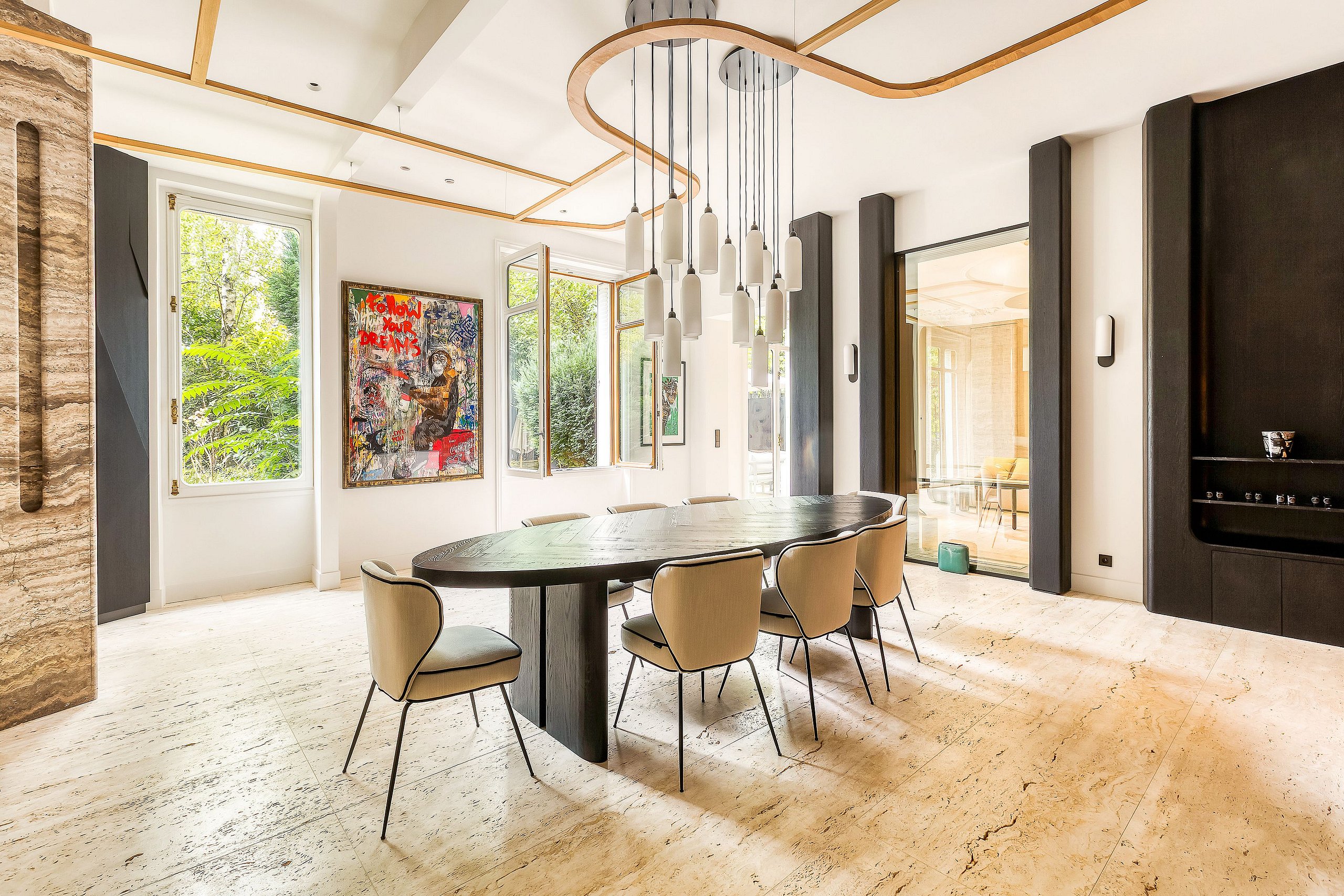 Entirely clad in Italian travertine marble, it opens onto a magnificent 180 m² private garden and benefits from an independent entrance directly accessible from the avenue.