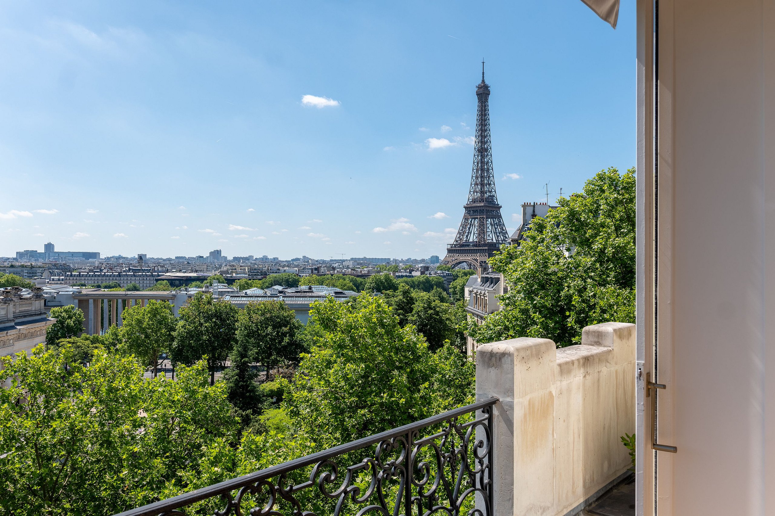 Step into a beautifully designed living space where the living room, dining area, and fully equipped kitchen open directly onto a large balcony that runs the full length of the façade. Wide enough for dining or enjoying evening drinks, the balcony boasts one of the most spectacular panoramic views in Paris: the Eiffel Tower, Les Invalides, the Panthéon, the Palais de Tokyo, and the Palais Galliera, right across the street.