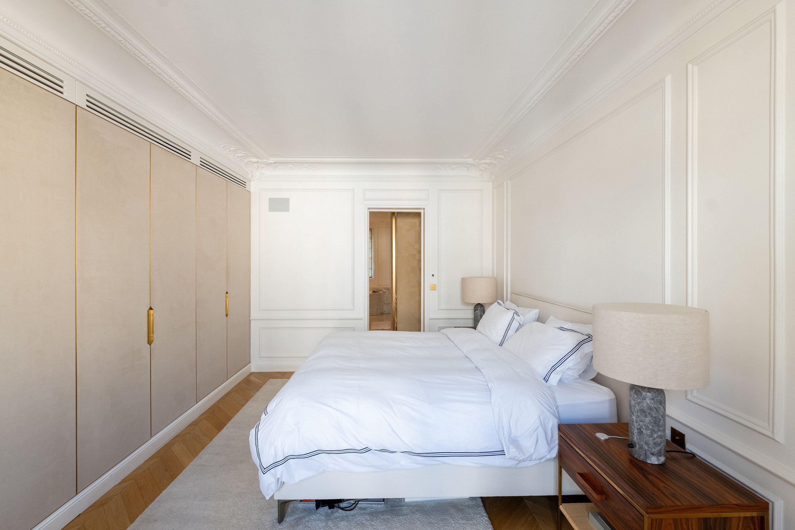 The apartment boasts two large suites, each designed as a peaceful haven. These suites include spacious bedrooms, custom-built walk-in closets, and luxuriously appointed en-suite bathrooms. High-quality materials and refined finishes create an atmosphere of understated luxury.
