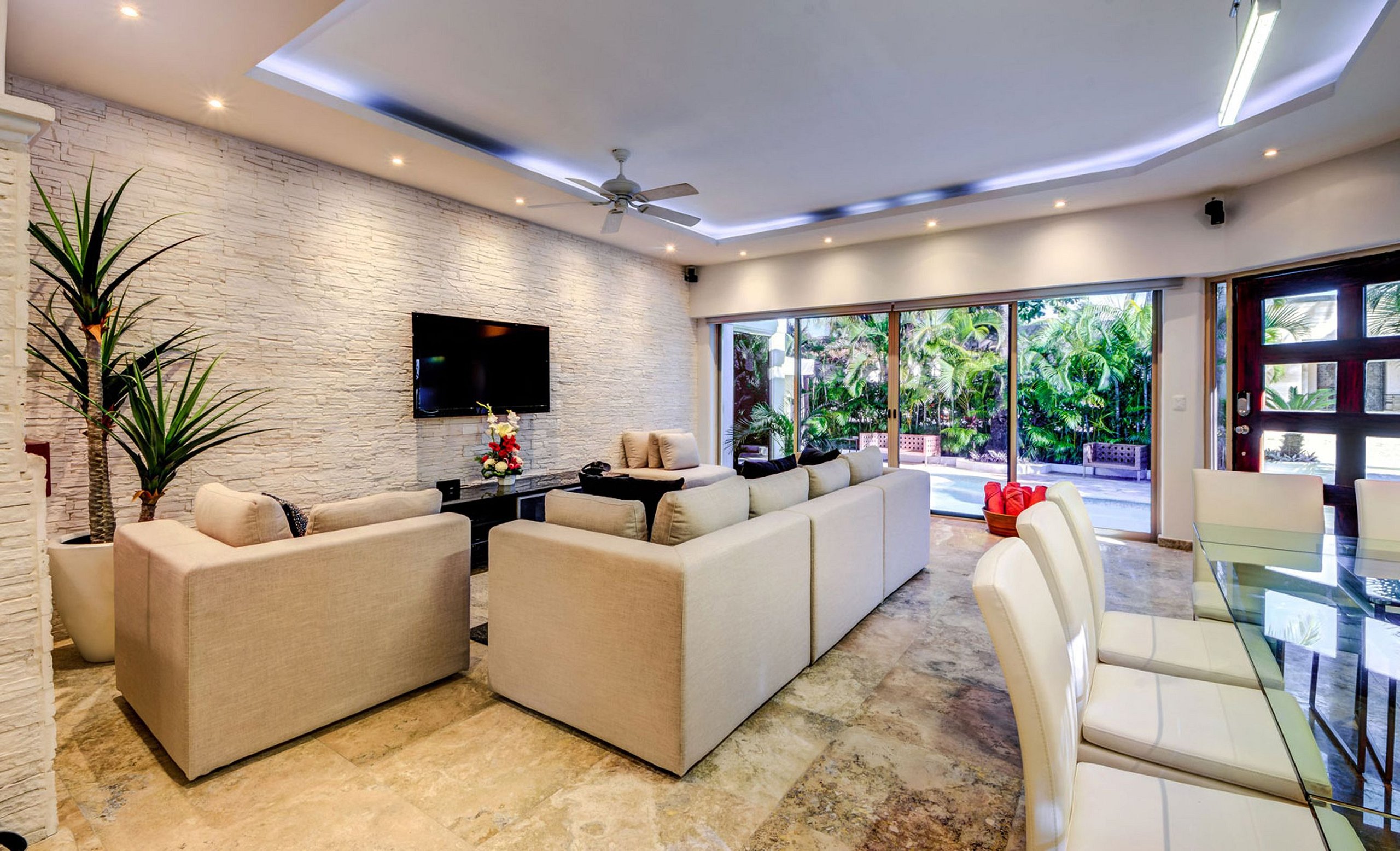 Palapa-style living and state-of-the-art architecture leave the house feeling sleek and tropical with a touch of avant-gardism. Relax on the white leather couches or feast in style in the dining area for 8 next to the magnificent kitchen. White brick walls in the living and dining area complete the themes of minimalism and edgy design. The fully equipped kitchen includes a breakfast bar and is perfect for the culinary genius in the group.