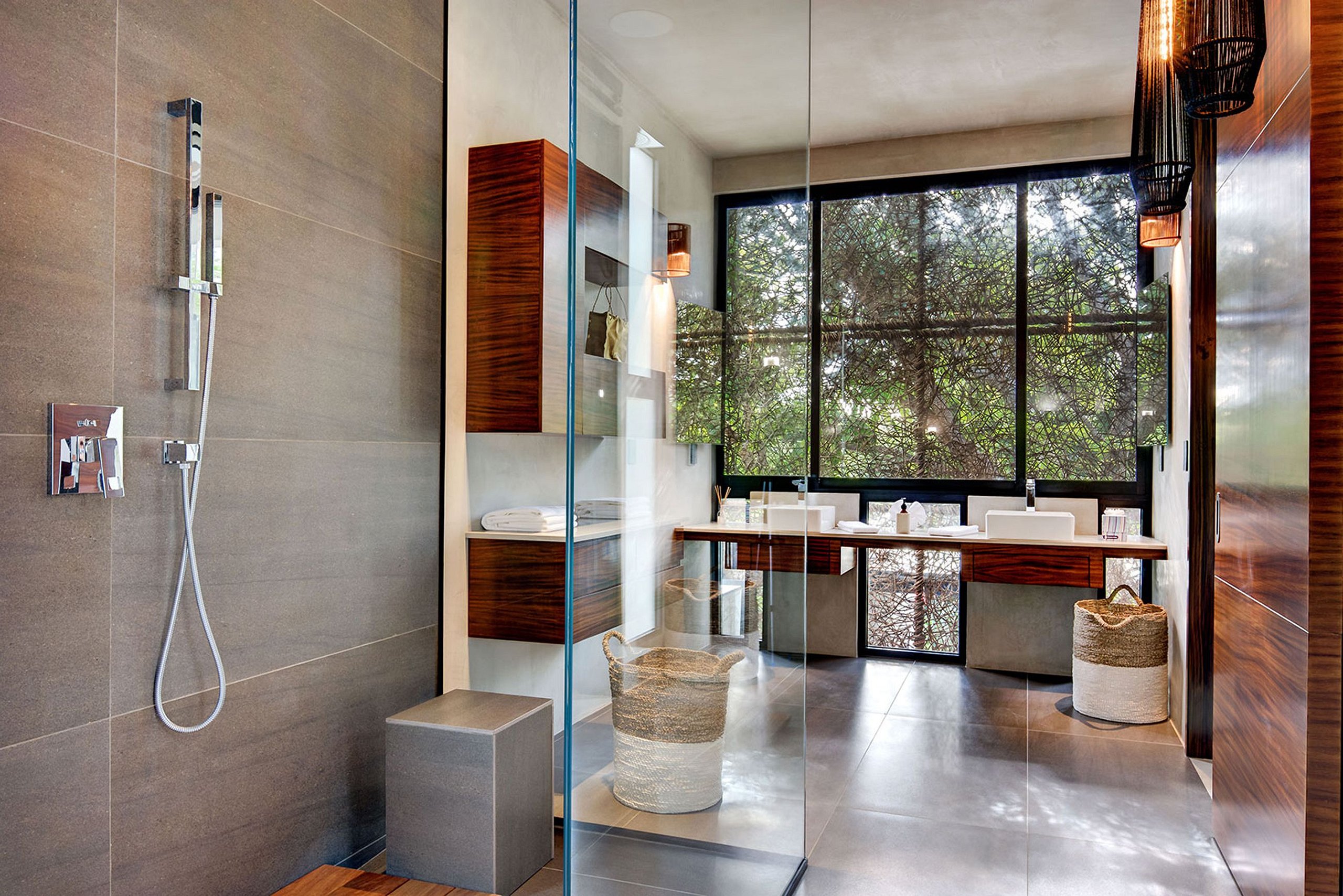 The bedrooms uphold the same exquisite aesthetic as the rest of the villa, providing ample space for relaxation. Two rooms on the second floor share a balcony that overlooks the garden, while the downstairs suite enjoys exclusive access to the pool and deck. All bedrooms boast spacious bathrooms equipped with high-end amenities.