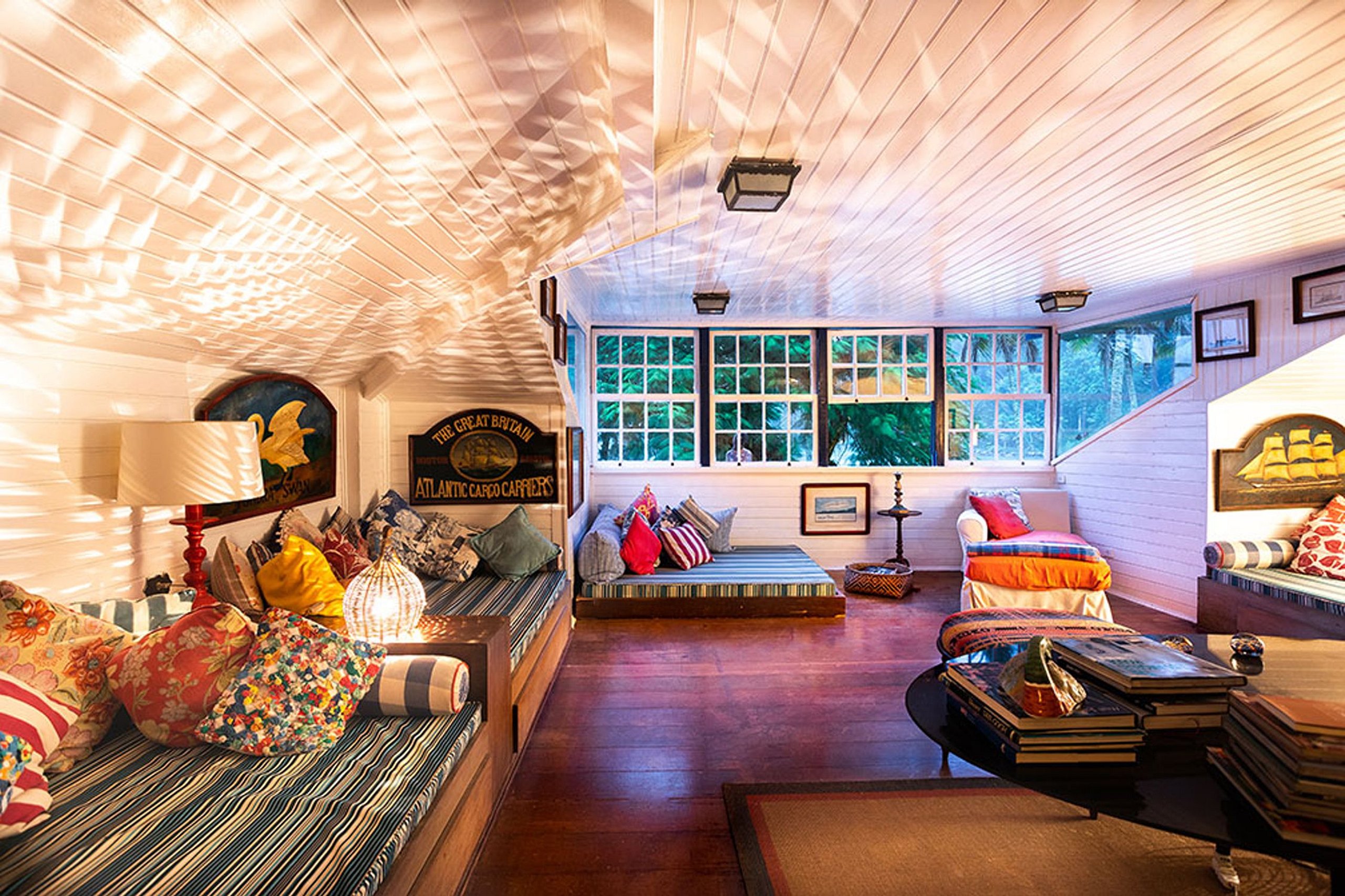 The decor features pieces picked up by the family in nautical antique shops for over 50 years, such as original ship compasses, diving suits and imitations of English sailing boats, mixed with navy colors and tropical themes. The living room is integrated into the kitchen, which in turn is connected to a new outdoor gourmet area. The second kitchen has all Viking brand equipment, aiming to deliver the best to food lovers. Also part of the gourmet kitchen is a classic Berkel 1920, known as "the most beautiful and classic slicer of cold cuts in the world", which also works as a decoration piece.