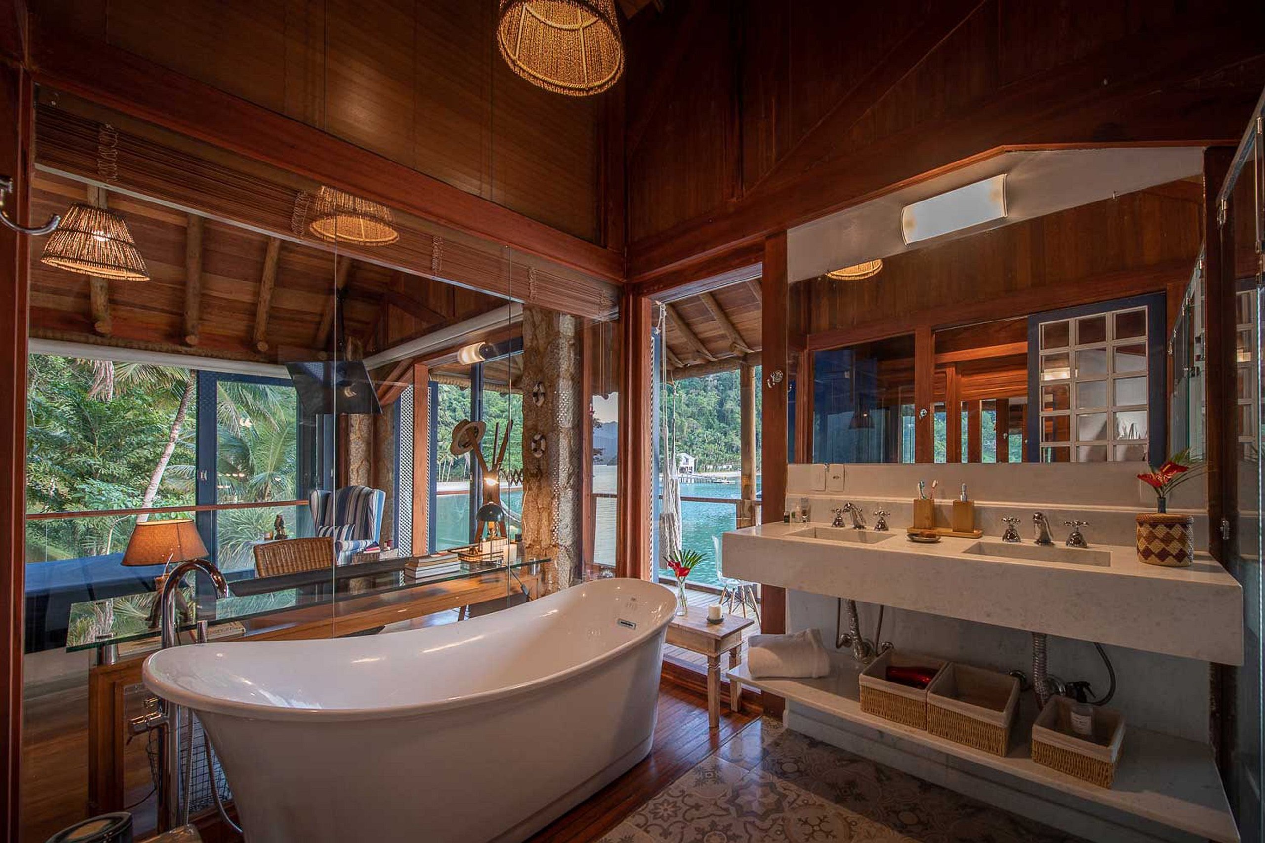 The Master Suite Ocean View 2 has a door overlooking the sea and windows open to the Atlantic Forest, an ofurô-style bathtub and is lit with natural light.