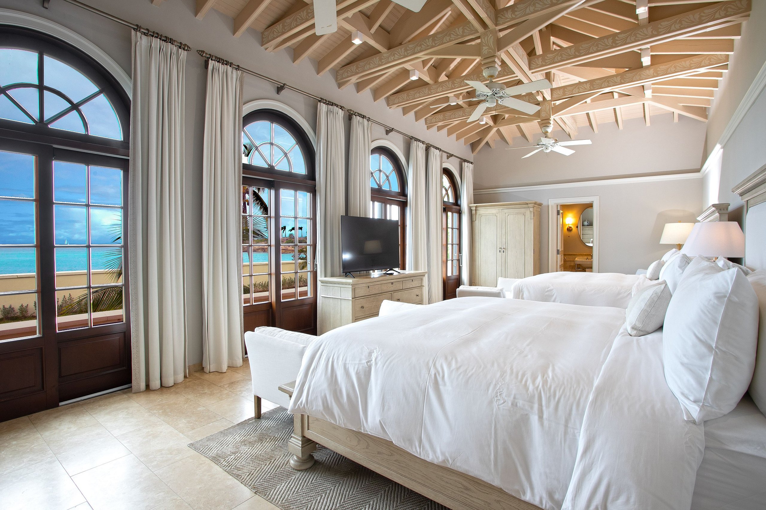 Set directly on the white sands of Plum Bay, this ten-bedroom beachfront villa offers a private and fully staffed retreat for groups or extended families. The property is composed of two separate villas—one oceanside with six bedrooms and one garden-side with four—offering generous space and flexibility for guests.