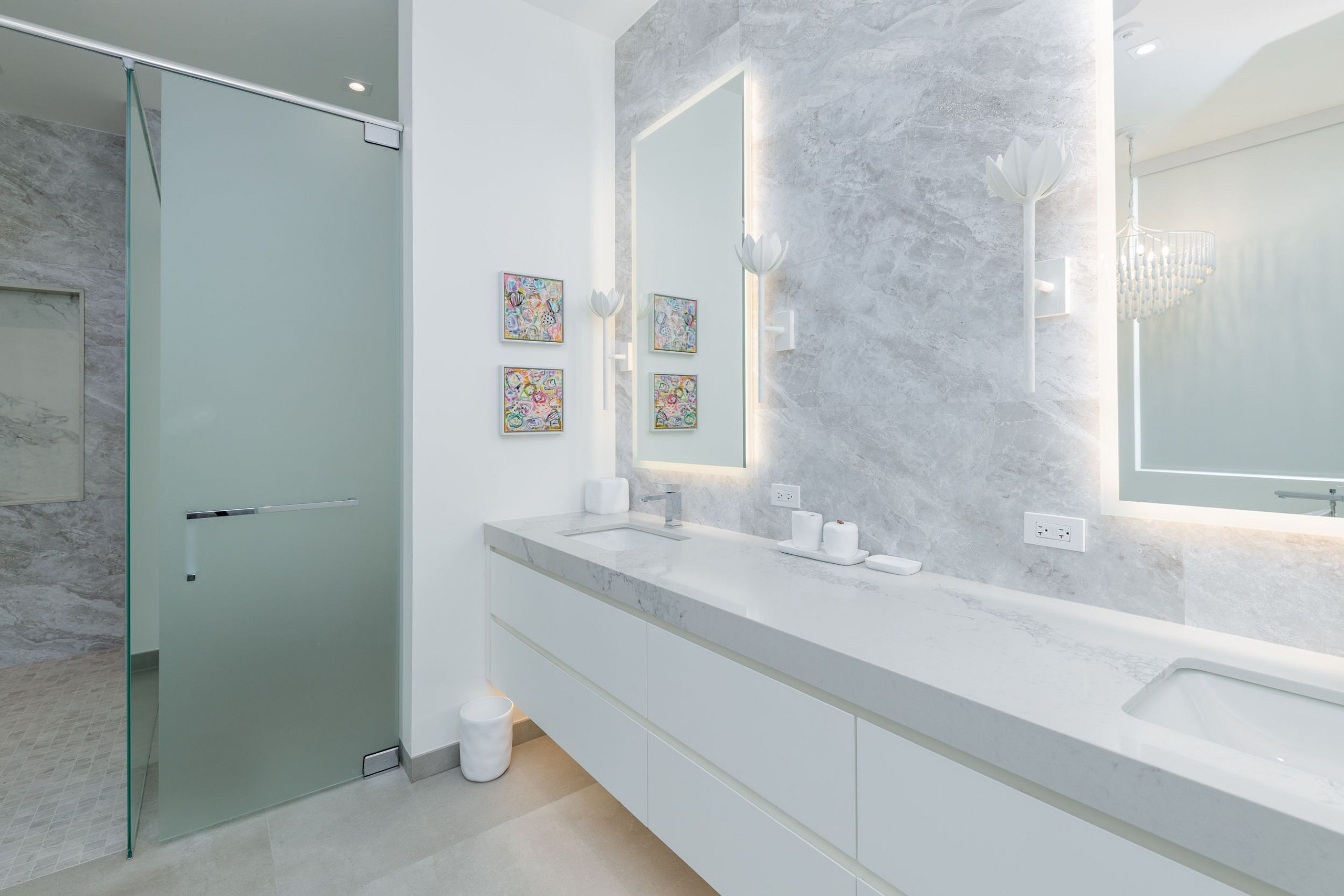 High ceilings and picture windows fill the interiors with light, connecting open-plan lounges and dining areas with stunning sea views. Elegant finishes in stone, granite, and quartz highlight the soft neutral tones of the décor. The villa also features a state-of-the-art indoor and outdoor kitchen, a beachfront infinity pool with outdoor shower, and multiple terraces and decks for al fresco dining, relaxing, and entertaining. Just five minutes from shops and restaurants, this is island living at its finest.