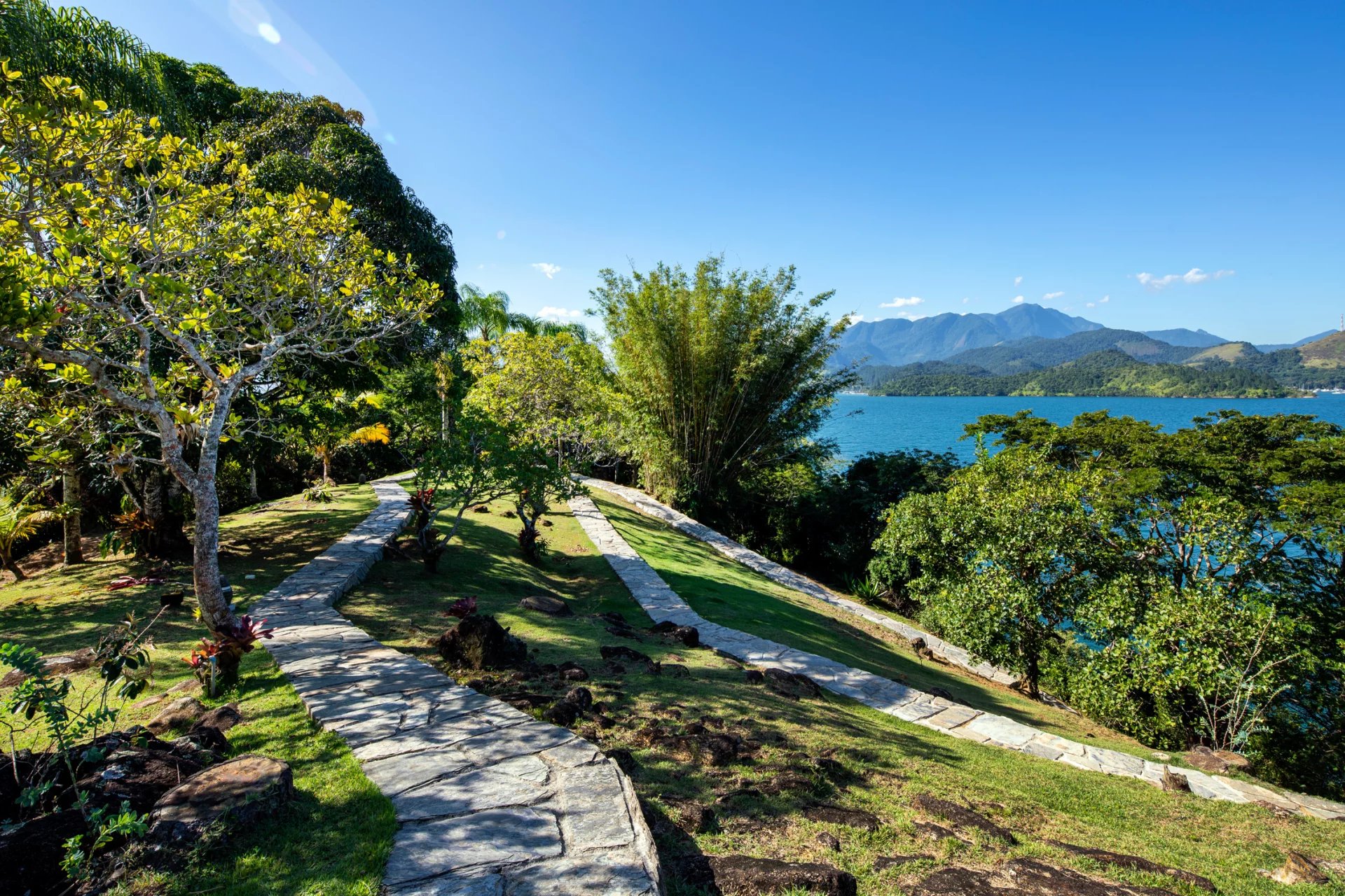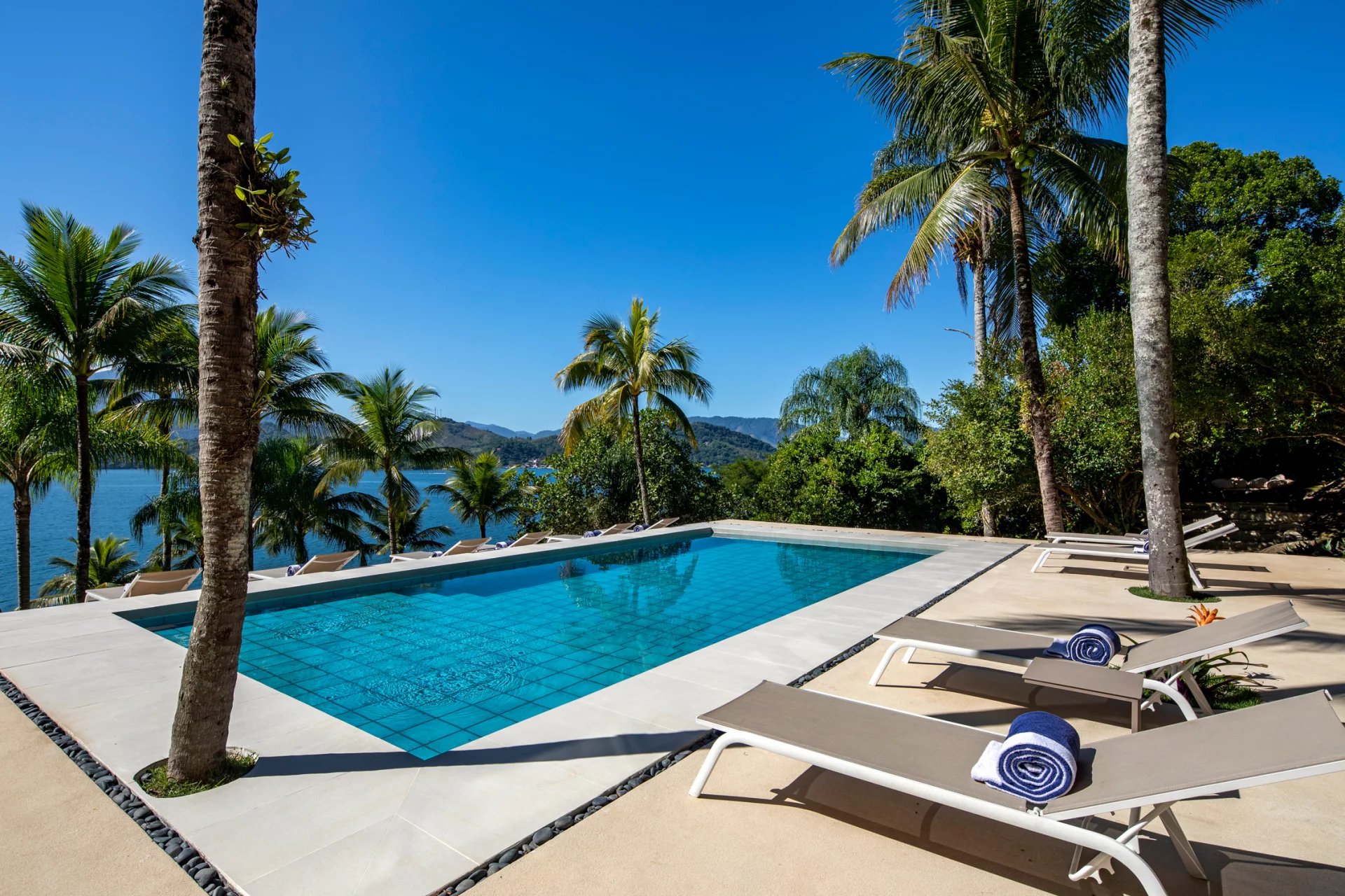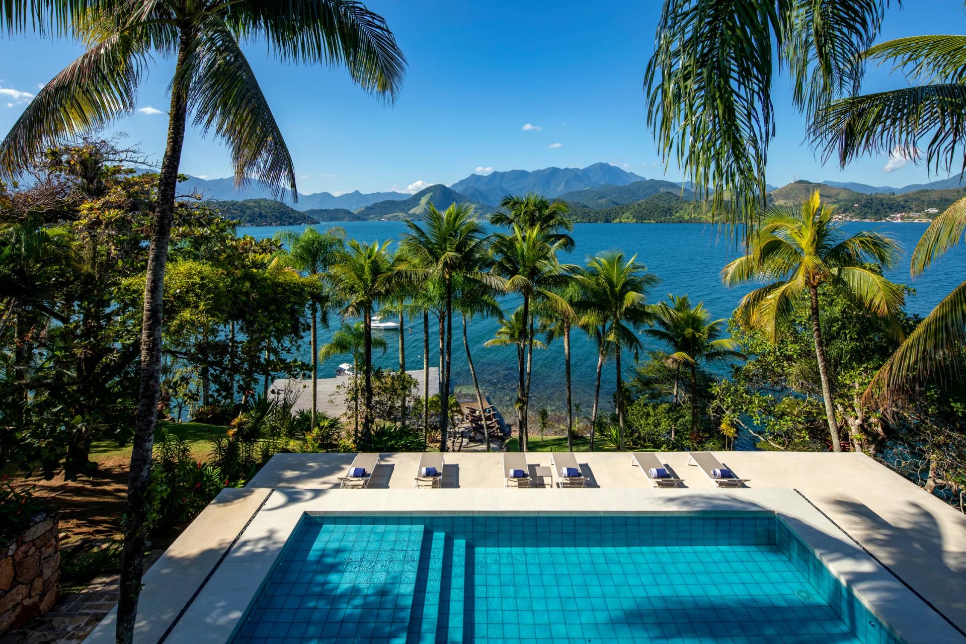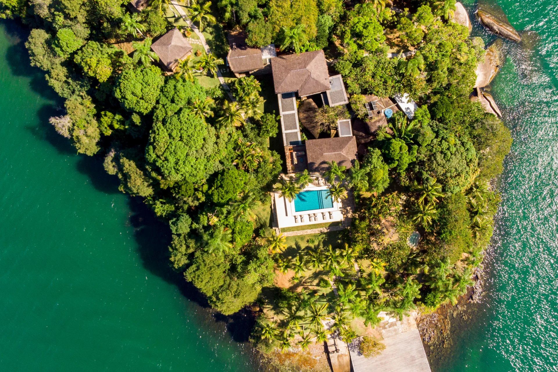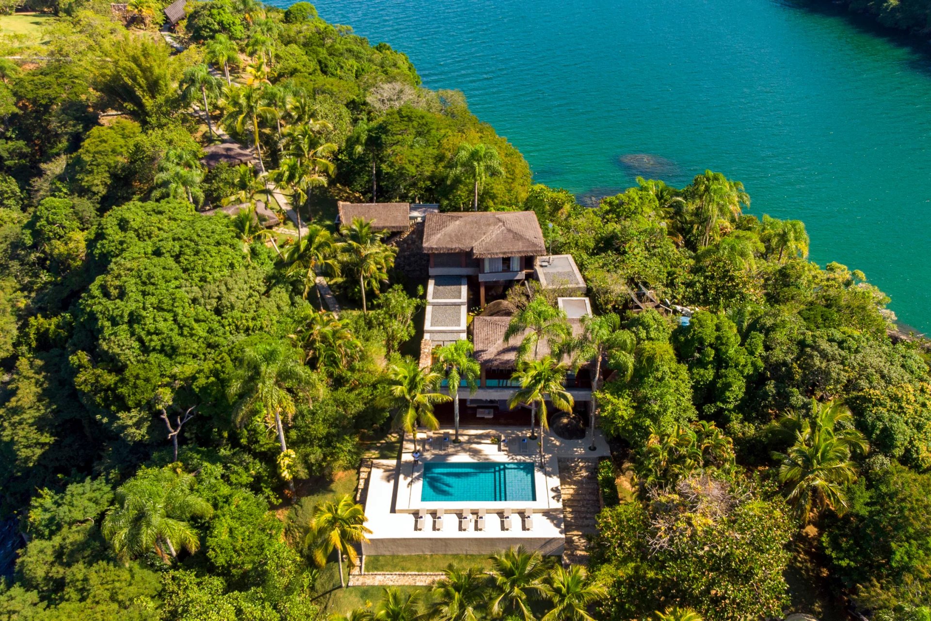 This is a private and exclusive island located 7 km off the coast of Angra dos Reis, a municipality 168 km from the city of Rio de Janeiro located on the Costa Verde, a region surrounded by the Atlantic Forest, with a calm and crystal clear sea. A residential property, covering 25,000 sqm and offering luxurious accommodation for up to 10 guests, a huge common area and private beach. The island has common areas created to offer unique experiences. Among them is a beautiful outdoor terrace with a dining room and barbecue; a pool area surrounded by a deck and extended by a comfortable lounge connected to the Main House by a glassed-in corridor that follows an ornamental lake sculpted, among characteristics, by indigenous stones. An area with a gazebo, ideal for lunch and relaxation, a solarium, a luxurious outdoor Jacuzzi overlooking the sea and a private beach. By boat, it is less than 7 minutes from Frade or the villa of Angra dos Reis or less than 1h20 from the city of Rio de Janeiro or Paraty. 5 bedrooms (Main House: 1 master suite and 1 king suite, 2 bungalows and 1 boathouse suite) Wi-fi throughout the property. Entertainment room with HD projector with films, cable TV and sorround sound. Internal / External Sonos audio system throughout the property. Fully equipped state-of-the-art kitchen. Stylish interior design Dining room / barbecue on an external terrace (table for 15). Pool Deck Pool lounge Jacuzzi for 8 People Solarium Private Beach Speedboat (Including transfer for arrival/departure) Heliport that can support 2 helicopters