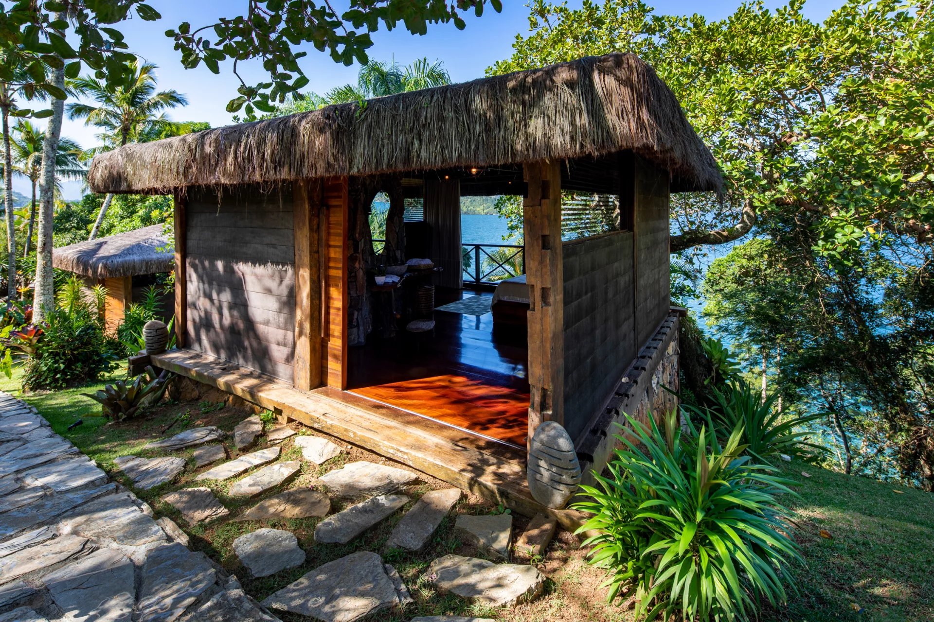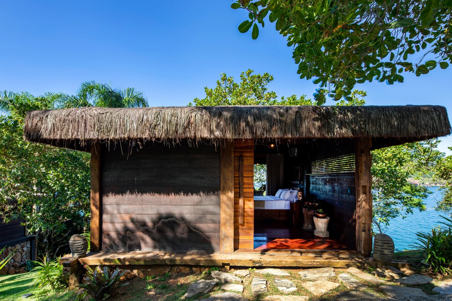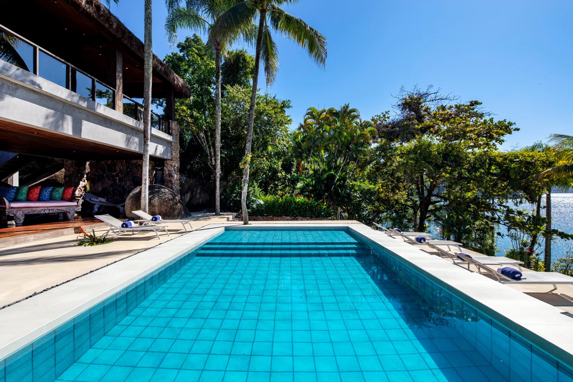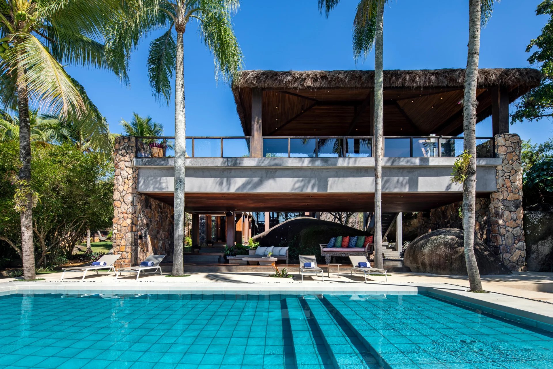 This is a private and exclusive island located 7 km off the coast of Angra dos Reis, a municipality 168 km from the city of Rio de Janeiro located on the Costa Verde, a region surrounded by the Atlantic Forest, with a calm and crystal clear sea. A residential property, covering 25,000 sqm and offering luxurious accommodation for up to 10 guests, a huge common area and private beach. The island has common areas created to offer unique experiences. Among them is a beautiful outdoor terrace with a dining room and barbecue; a pool area surrounded by a deck and extended by a comfortable lounge connected to the Main House by a glassed-in corridor that follows an ornamental lake sculpted, among characteristics, by indigenous stones. An area with a gazebo, ideal for lunch and relaxation, a solarium, a luxurious outdoor Jacuzzi overlooking the sea and a private beach. By boat, it is less than 7 minutes from Frade or the villa of Angra dos Reis or less than 1h20 from the city of Rio de Janeiro or Paraty. 5 bedrooms (Main House: 1 master suite and 1 king suite, 2 bungalows and 1 boathouse suite) Wi-fi throughout the property. Entertainment room with HD projector with films, cable TV and sorround sound. Internal / External Sonos audio system throughout the property. Fully equipped state-of-the-art kitchen. Stylish interior design Dining room / barbecue on an external terrace (table for 15). Pool Deck Pool lounge Jacuzzi for 8 People Solarium Private Beach Speedboat (Including transfer for arrival/departure) Heliport that can support 2 helicopters