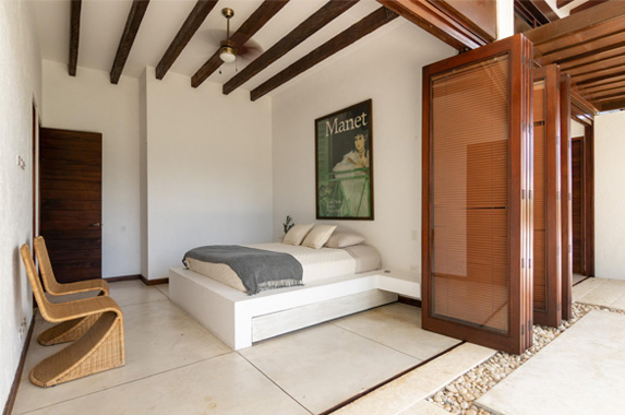 The villa has five bedrooms, each with its own en-suite bathroom and direct access to the outdoors. Every room looks out onto nature, offering privacy and tranquility. Ceiling fans are found throughout, and two of the rooms (including the master) also have air conditioning.
