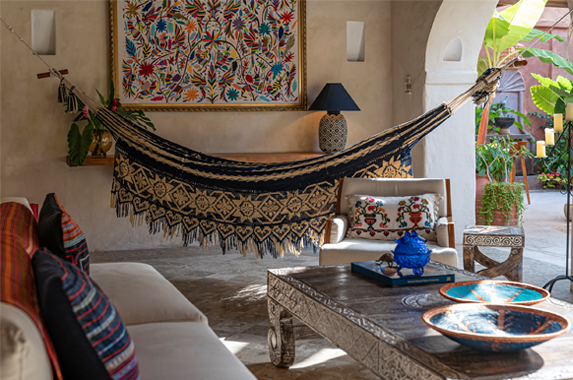 The interiors blend together textures of rustic wood, smooth stone, rich fabrics, and artisanal decor from Colombia and around the world. Living spaces are filled with natural light thanks to strategic windows and open courtyards.