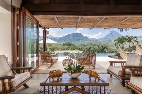 Set on 9 acres of rolling green hills, this five-bedroom villa is just over an hour south of Medellín. With panoramic views of Cerro Tusa, an infinity pool, and palm-studded gardens, it’s the perfect setting for slow mornings and sunset dinners. Equipped with Starlink WiFi and full staff, it blends rustic charm with comfort and privacy.