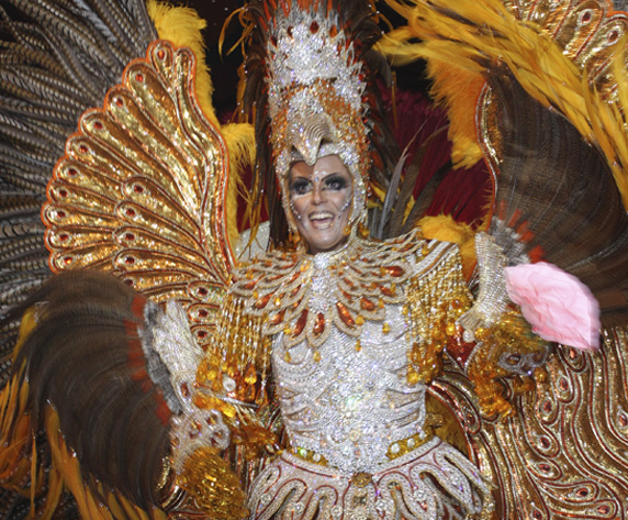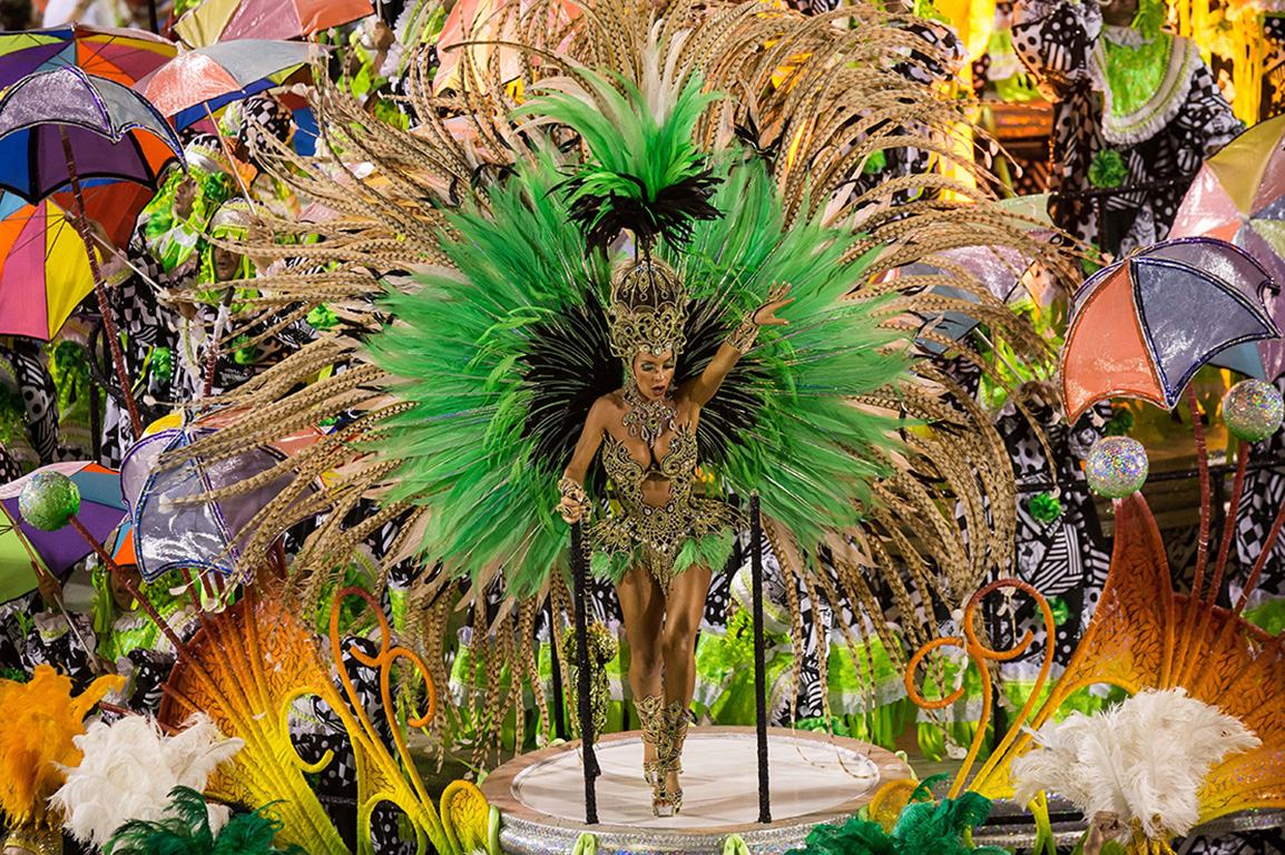 Nowadays the most spectacular luxury costumes originate primarily from the parade of the Special Group of Samba Schools of Rio de Janeiro, the headliner event of the Brazilian Carnival. This Rio Carnival Parade is a contest with each of the thirteen top samba organizations (called samba schools) presenting their theme, their story, within the 80-minute parade limit. The parade is thought of as a “walking opera-ballet” with style, esthetics, and exquisite costuming an essential element. During the parade, the gigantic floats serve as moving theater sets for the participants: the elite of the luxury costume stars with their spellbinding costumes are placed on the highest points in the top decks of the Carnival floats. These Carnival stars are united in their eternal passion for the Carnival and come from a myriad cross-section of backgrounds and professions such as actresses, fashion designers, surgeons, models, businessmen, athletes, hairstylists, TV stars, housewives.